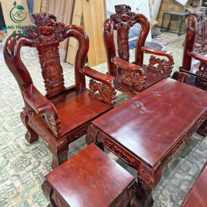 - Mô tả: Bộ salon gỗ tự nhiên dày dặn, chạm rồng sắc nét từ lưng tựa đến chân ghế, tạo điểm nhấn mạnh mẽ, trang trọng cho không gian tiếp khách. Tay ghế uốn cong, bo tròn chắc chắn, mặt ghế và bàn liền mạch. Chân ghế, chân bàn chạm hoa văn đồng bộ. Đây là dòng ghế phù hợp cho nhà phố, phòng khách lớn hoặc người chuộng phong cách gỗ truyền thống.