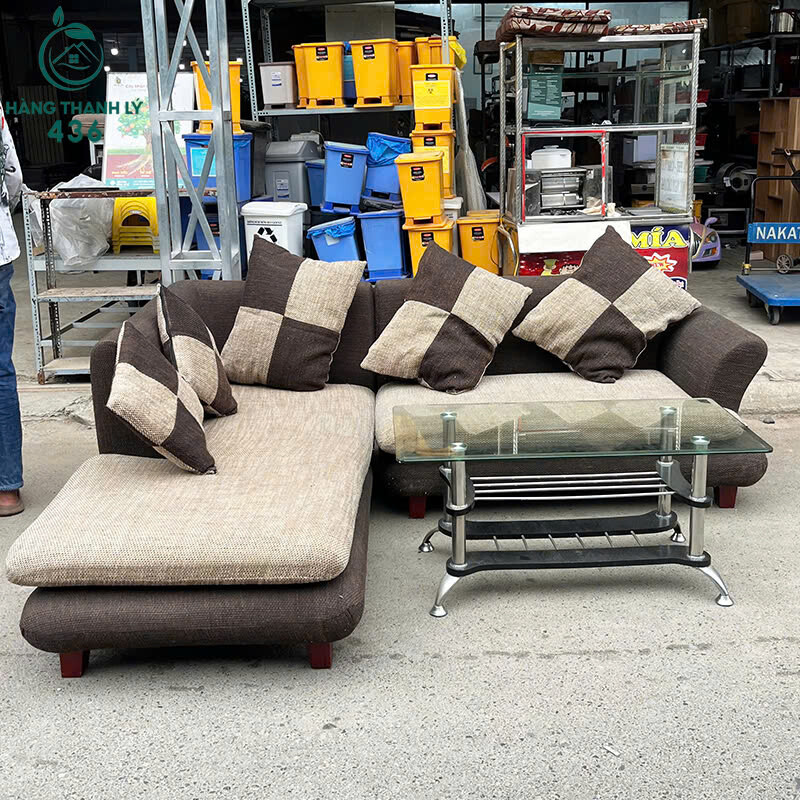 Mô tả: Bộ sofa góc chữ L cũ với tông màu nâu – kem dễ phối, mang lại cảm giác ấm cúng cho phòng khách hoặc phòng trọ. Chất liệu nỉ ngồi êm, phần tựa lưng có nhiều gối trang trí giúp ngồi thư giãn thoải mái. Khung sofa chắc chắn, đệm không bị xẹp nhiều, phù hợp dùng sinh hoạt hằng ngày. Đi kèm là bàn kính mặt trong suốt, chân inox vững vàng, tiện đặt ly tách, remote hay đồ trang trí. Bộ sản phẩm thích hợp cho gia đình, căn hộ nhỏ hoặc làm sofa tiếp khách tại cửa hàng.