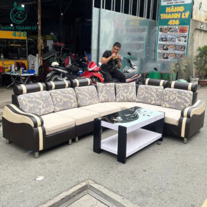 - Mô tả: Bộ sofa cũ chữ L phối màu nâu – kem kết hợp họa tiết hoa mang phong cách hiện đại, sang trọng và dễ phối với nhiều không gian. Khung chắc chắn, bọc da dễ vệ sinh, phần nệm ngồi êm ái, lưng tựa vải nỉ hoa thoáng mát. Bộ gồm 1 sofa chữ L dài rộng, kèm bàn kính mặt đen trắng, phù hợp cho phòng khách gia đình, văn phòng hoặc showroom trưng bày. Hàng còn mới khoảng 90%, sử dụng tốt ngay, không rách, không sập form, cực kỳ bền bỉ. Mẫu sofa này tạo cảm giác ấm cúng, tinh tế và tiện nghi cho mọi không gian.