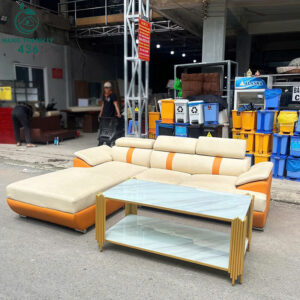 - Mô tả: Bộ sofa góc L cũ bọc da, tông màu kem phối cam trẻ trung, mang đến cảm giác tươi sáng, sang trọng cho phòng khách hoặc văn phòng. Thiết kế góc L giúp tối ưu không gian, ngồi thoải mái cho 4–5 người. Nệm mút dày, đàn hồi tốt, khung sofa chắc chắn, bọc da mềm mịn, dễ lau chùi. Lưng tựa cao có gối đầu nâng đỡ cổ vai, mang lại cảm giác thư giãn khi ngồi hoặc nằm. Bộ sofa còn mới khoảng 90%, kèm bàn sofa mặt kính khung vàng, rất phù hợp setup phòng khách, quán cafe hoặc salon.