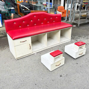 - Mô tả: Bộ ghế nail cũ gồm một ghế dài tựa lưng bọc nệm đỏ, điểm nhấn là các nút rút tạo cảm giác êm ái và thẩm mỹ. Phần chân ghế màu trắng tích hợp ba hộc mở và một ngăn kéo, giúp lưu trữ dụng cụ làm nail hoặc vật dụng cá nhân tiện lợi. Kèm theo là hai ghế đôn nhỏ cùng tông màu, có nệm đỏ và ngăn kéo riêng, tăng thêm công năng sử dụng. Thiết kế nổi bật, phù hợp cho tiệm nail, salon hoặc không gian làm đẹp tại nhà. Sản phẩm vẫn giữ được độ mới và độ chắc chắn.