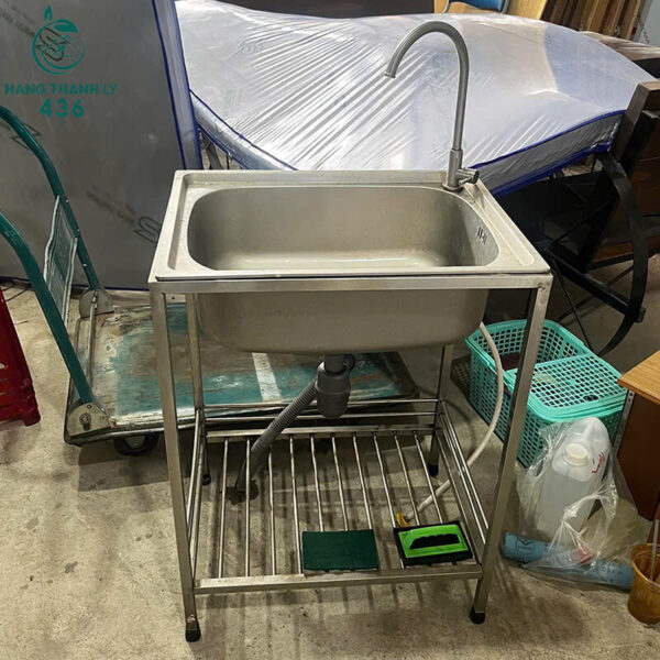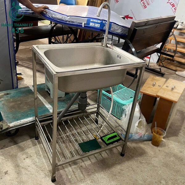- Mô tả: Bồn rửa inox cũ chắc chắn, phù hợp cho nhà bếp, quán ăn hoặc khu chế biến thực phẩm. Bồn gồm một chậu rửa sâu, rộng rãi, gắn với vòi nước cong hiện đại bằng inox. Phía dưới có khung đỡ với các thanh song song tạo thành giá để vật dụng như miếng rửa chén, chai lọ hoặc dụng cụ làm bếp. Ống thoát nước được nối gọn gàng dưới đáy chậu, đảm bảo thoát nước nhanh chóng. Tổng thể bồn mang lại cảm giác bền bỉ, tiện lợi và dễ vệ sinh.