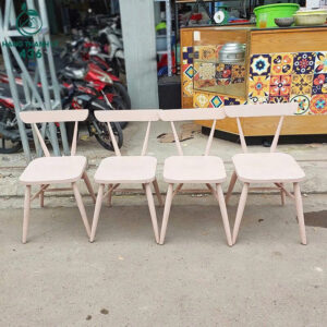 - Mô tả: Ghế gỗ cũ sơn màu kem nhạt, kiểu dáng đơn giản nhưng vẫn tinh tế. Mặt ghế bo tròn nhẹ, chân ghế kiểu vát tạo điểm nhấn trẻ trung. Phần tựa lưng ngang thấp giúp người ngồi có tư thế thoải mái, thích hợp dùng trong các quán cafe, trà sữa, khu vực ăn uống hoặc không gian decor hiện đại. Màu sắc tươi sáng giúp dễ phối với bàn và không gian xung quanh.