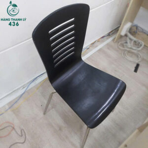 - Mô tả: Mẫu ghế nhựa cũ màu đen với thiết kế hiện đại, lưng tựa có khe thoáng tạo cảm giác mát mẻ khi ngồi lâu. Ghế được làm từ nhựa form ngồi cong nhẹ giúp nâng đỡ lưng tốt hơn. Chân ghế làm bằng inox sáng bóng, chắc chắn, chống gỉ sét, phù hợp với môi trường văn phòng hoặc quán cafe. Ghế dễ lau chùi và nhẹ, thuận tiện cho việc di chuyển, sắp xếp linh hoạt trong nhiều không gian.