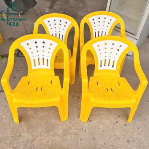 - Mô tả: Ghế nhựa có tựa lưng và tay vịn liền khối, kiểu dáng phổ thông, dễ sử dụng trong nhiều hoàn cảnh. Lưng ghế thiết kế có lỗ thoáng khí, giúp ngồi lâu không bí lưng. Mặt ngồi rộng, các rãnh thoát nước chống đọng nước khi sử dụng ngoài trời. Màu vàng kết hợp trắng nổi bật, dễ nhận diện trong quán ăn, khu vui chơi, sân vườn hoặc nhà hàng bình dân. Dễ lau chùi, nhẹ và dễ di chuyển, không chiếm diện tích.