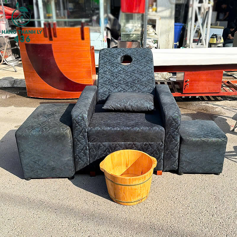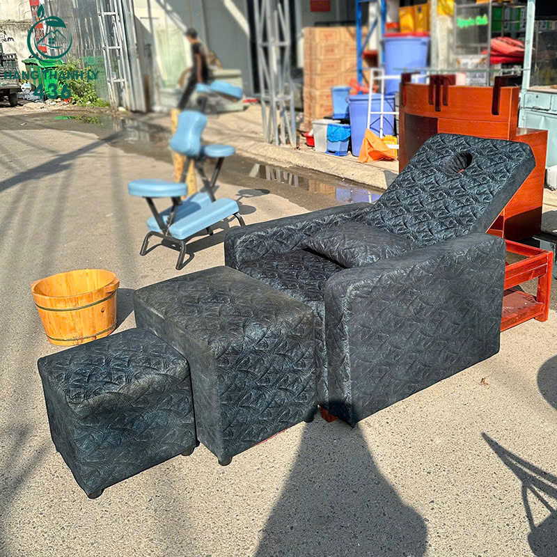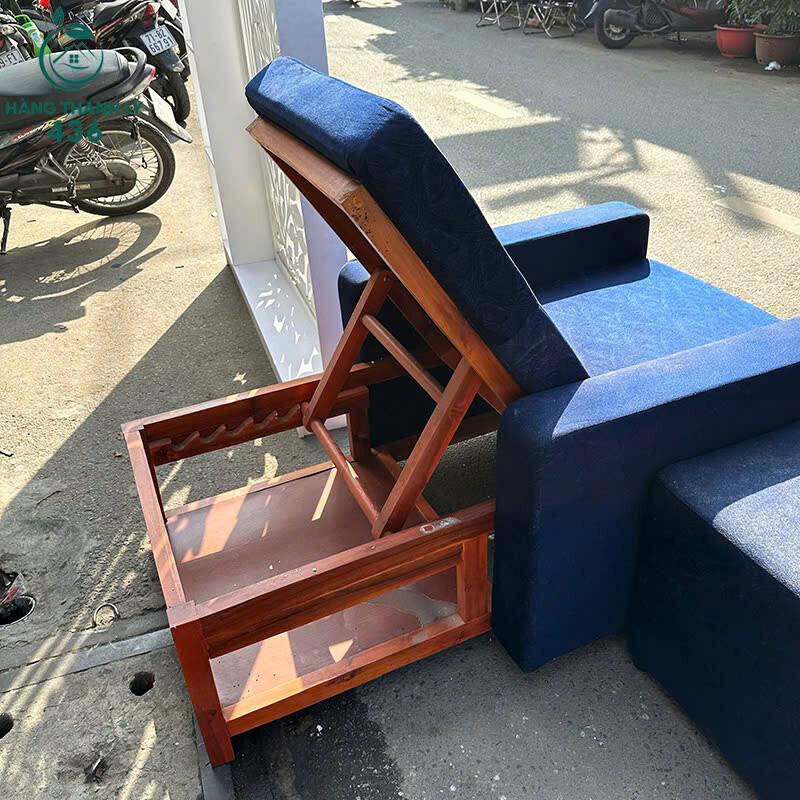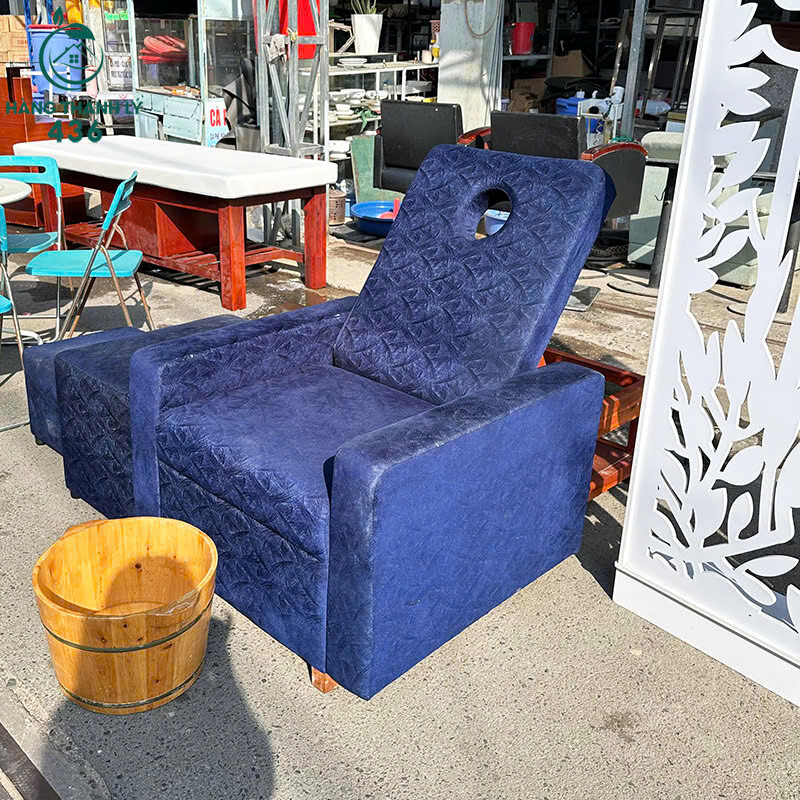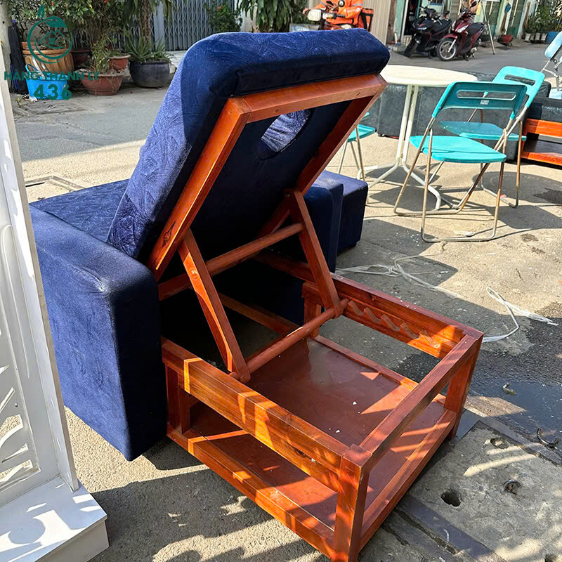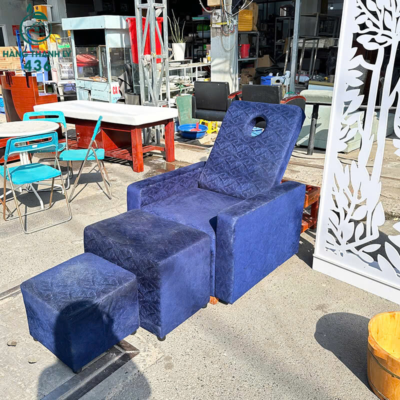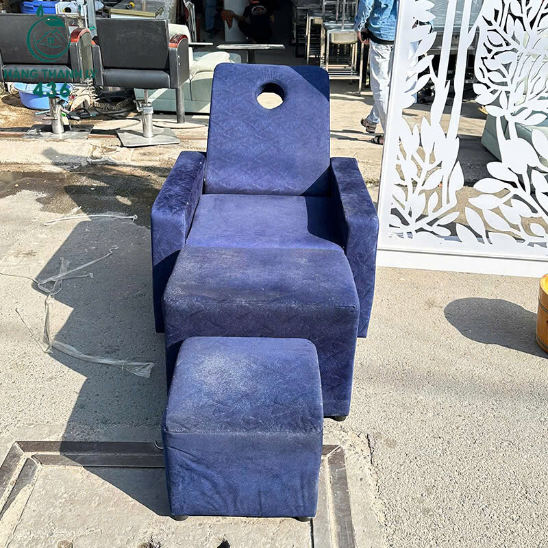 Mô tả: Mẫu ghế thư giãn thiết kế ngả lưng linh hoạt, có phần kéo dài để gác chân giúp nằm nghỉ thoải mái. Ghế bọc nỉ màu xanh đậm, đệm dày ngồi êm, khung gỗ chắc chắn, sử dụng ổn định. Phù hợp đặt trong phòng khách, phòng ngủ, spa, tiệm nail hoặc khu vực nghỉ ngơi cá nhân.