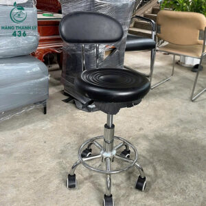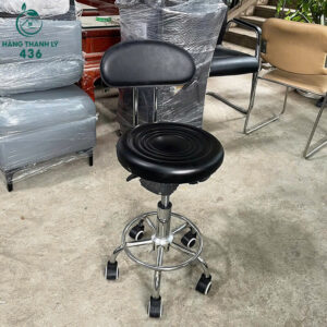 - Mô tả: Ghế tròn cũ có tựa lưng được bọc da màu đen cao, bề mặt mịn và dễ vệ sinh. Thiết kế khung sáng bóng, bánh xe lăn êm giúp di chuyển linh hoạt trên mọi mặt sàn. Chiều cao có thể điều chỉnh dễ dàng nhờ cần gạt thủy lực tiện dụng. Phần đệm ghế dày, ngồi êm và tạo cảm giác thoải mái khi sử dụng lâu. Mẫu ghế phù hợp cho spa, tiệm nail, salon tóc, quầy lễ tân hoặc văn phòng. Hàng còn mới khoảng 90%, kết cấu chắc chắn, vận hành mượt.