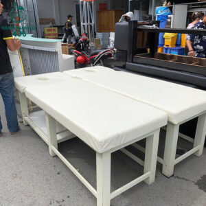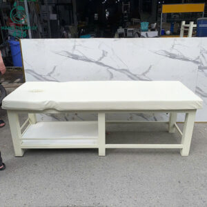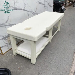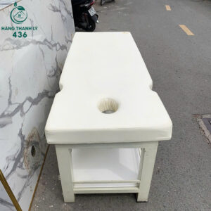 - Mô tả: Giường massage cũ thiết kế hiện đại, chắc chắn, phù hợp cho spa, tiệm massage, chăm sóc da hoặc sử dụng cá nhân tại nhà. Toàn bộ mặt giường bọc da simili màu trắng kem, nệm dày êm ái, có lỗ tròn đặt mặt tiện lợi khi nằm úp. Khung giường làm từ gỗ, chịu lực tốt, có tầng dưới để khăn hoặc vật dụng spa, giúp tối ưu không gian sử dụng. Bề mặt da trơn dễ lau chùi, hạn chế bám bụi và chống thấm hiệu quả. Hàng còn mới khoảng 90%, sạch đẹp, không lún, đảm bảo sử dụng bền lâu và an toàn cho người dùng.