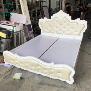 Mô tả: Giường ngủ thiết kế đẹp mắt với đầu giường bọc da màu kem, tạo điểm nhấn cho phòng ngủ. Mặt giường làm từ gỗ sồi chắc chắn, bền bỉ, khung giường được sơn màu trắng, mang đến không gian sang trọng. Đặc biệt, chân giường cao giúp không gian thoáng đãng và dễ dàng vệ sinh. Giường này có thể kết hợp với nhiều phong cách nội thất khác nhau, từ cổ điển đến hiện đại. Tình trạng giường còn mới khoảng 90%, phù hợp với những ai đang tìm kiếm món nội thất sang trọng nhưng giá hợp lý.