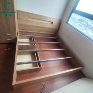 - Mô tả: Đây là mẫu giường ngủ hiện đại và tiện lợi, rất được ưa chuộng trong các căn hộ chung cư. Giường được thiết kế dạng hộp chắc chắn, sử dụng bền lâu, không bị rung lắc hay kêu cọt kẹt khi nằm. Điểm nổi bật là phần đầu giường được thiết kế đơn giản nhưng có khe rỗng để bạn tiện đặt sách, điện thoại hoặc các vật dụng cá nhân. Đặc biệt, phía dưới gầm giường có tích hợp ngăn kéo lớn (hoặc hộc chứa đồ) giúp bạn tận dụng không gian để cất giữ chăn màn, quần áo trái mùa, giải quyết vấn đề thiếu chỗ chứa đồ. Màu sắc vân gỗ và trắng kết hợp tạo nên sự trẻ trung, sạch sẽ và hài hòa cho phòng ngủ.
