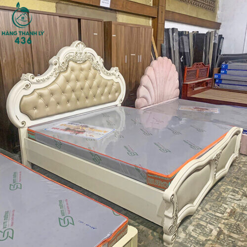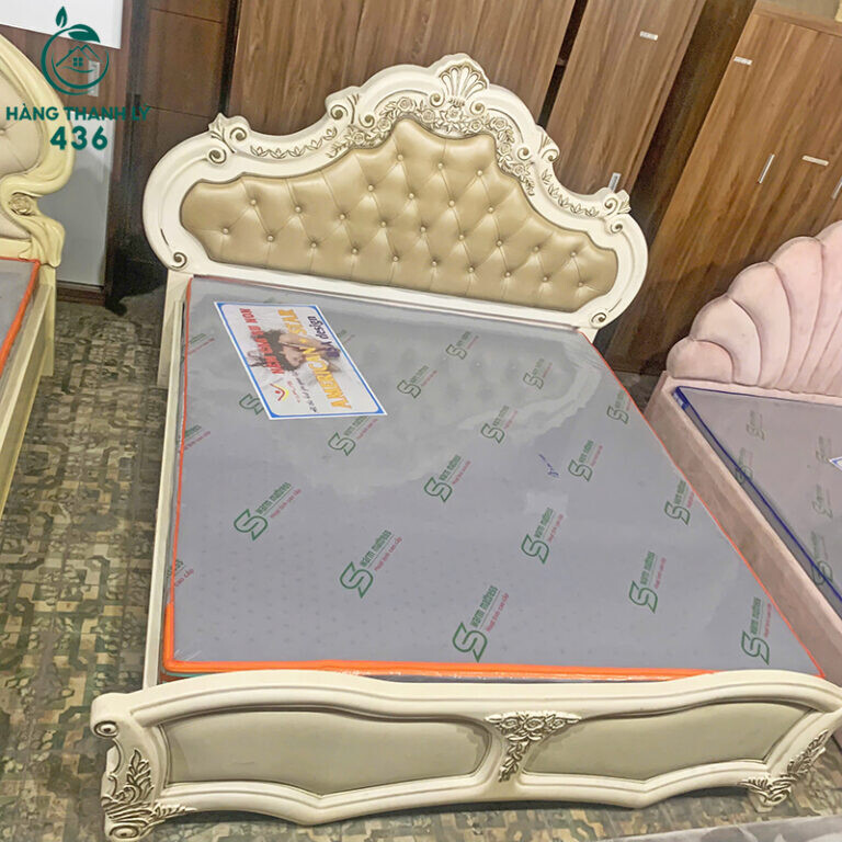 Mô tả: Mẫu giường ngủ tân cổ điển thanh lý gây ấn tượng với thiết kế sang trọng, đường nét chạm khắc tinh tế mang phong cách hoàng gia. Phần đầu giường bọc da màu kem, nhấn nút rút sâu tạo điểm nhấn thẩm mỹ và mang lại cảm giác êm ái khi tựa lưng. Khung giường chắc chắn, bề mặt hoàn thiện tỉ mỉ, màu sắc trang nhã dễ phối với nhiều không gian phòng ngủ cao cấp. Giường phù hợp sử dụng cho phòng ngủ gia đình, căn hộ, biệt thự hoặc nhà phố theo phong cách cổ điển – tân cổ điển.