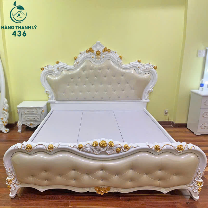 - Mô tả: Giường ngủ tân cổ điển được thiết kế tinh xảo, mang phong cách sang trọng và quý phái. Đầu giường bọc da màu trắng – vàng với các đường may chần nút tinh tế, tạo cảm giác êm ái và ấm áp khi tựa lưng. Khung giường làm từ gỗ công nghiệp chắc chắn, phủ sơn trắng kết hợp hoa văn mạ vàng, mang lại nét đẹp hoàng gia, đẳng cấp cho không gian phòng ngủ.