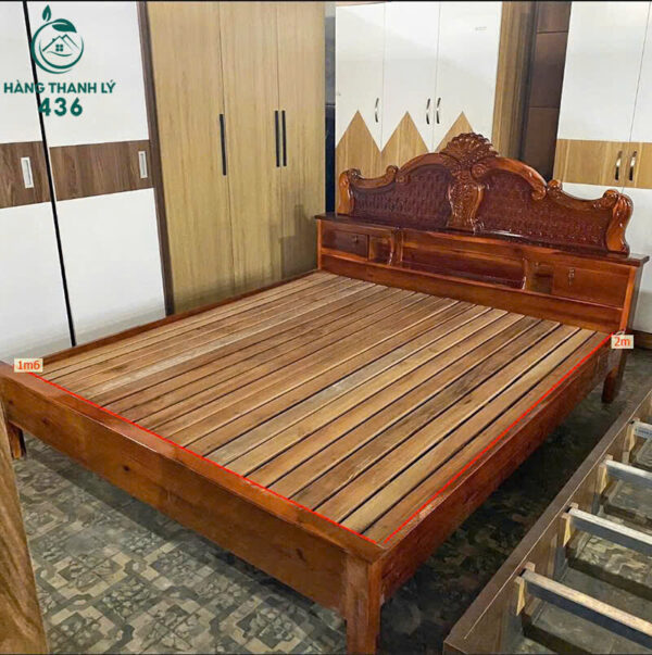 - Mô tả: Giường gỗ tự nhiên với thiết kế tinh xảo, đầu giường chạm trổ hoa văn sang trọng, tạo điểm nhấn cho không gian phòng ngủ. Bề mặt giường làm từ gỗ tự nhiên bền chắc, chịu lực tốt, khung giường chắc chắn, ít cong vênh theo thời gian. Phần đầu giường còn tích hợp ngăn kéo nhỏ, thuận tiện để lưu trữ các vật dụng cá nhân như sách, điều khiển hoặc phụ kiện nhỏ. Kích thước giường rộng rãi, phù hợp cho 2 người nằm thoải mái.