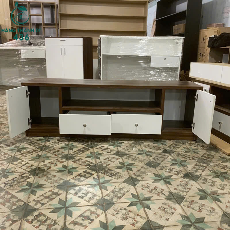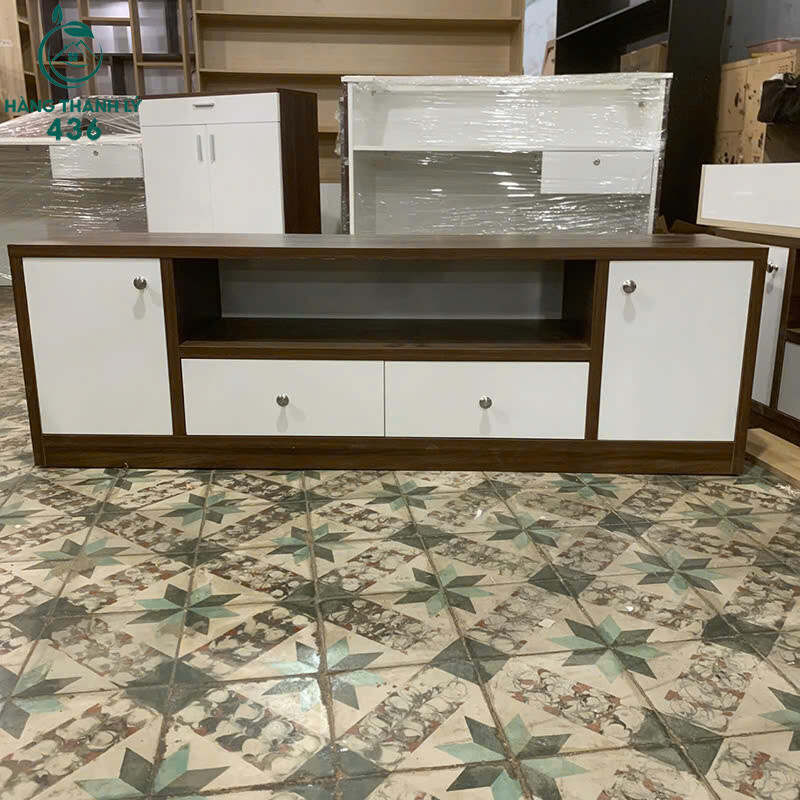 Mô tả: Mẫu kệ tivi này có thiết kế dài, thấp, phù hợp đặt sát tường phòng khách hoặc phòng sinh hoạt chung. Kệ gồm hộc trống ở giữa để đầu máy, modem, loa và các ngăn tủ hai bên giúp cất gọn đồ dùng, phụ kiện, sách báo hoặc vật dụng gia đình. Tông màu vân gỗ phối trắng nhìn sáng, dễ kết hợp nhiều kiểu nội thất từ hiện đại đến đơn giản. Kết cấu chắc chắn, mặt kệ rộng, chịu lực tốt, đặt tivi màn hình lớn ổn định.