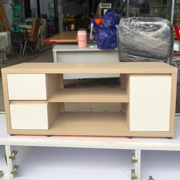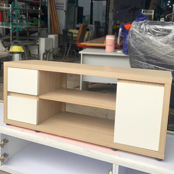 - Mô tả: Đây là một kệ tivi gỗ kiểu dáng hiện đại, thiết kế nhỏ gọn phù hợp cho phòng khách hoặc phòng ngủ. Sản phẩm có tông màu vân gỗ sáng kết hợp với cánh tủ màu trắng, tạo cảm giác trang nhã và dễ phối hợp với nhiều không gian nội thất khác nhau. Kệ gồm hai ngăn kéo bên trái, một khoang giữa mở tiện dụng để đặt đầu DVD, modem hoặc vật trang trí, và một ngăn tủ có cánh bên phải giúp cất giữ đồ dùng gọn gàng. Chất liệu gỗ gỗ dễ lau chùi và có độ bền cao.
