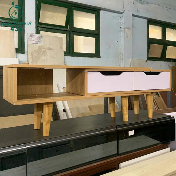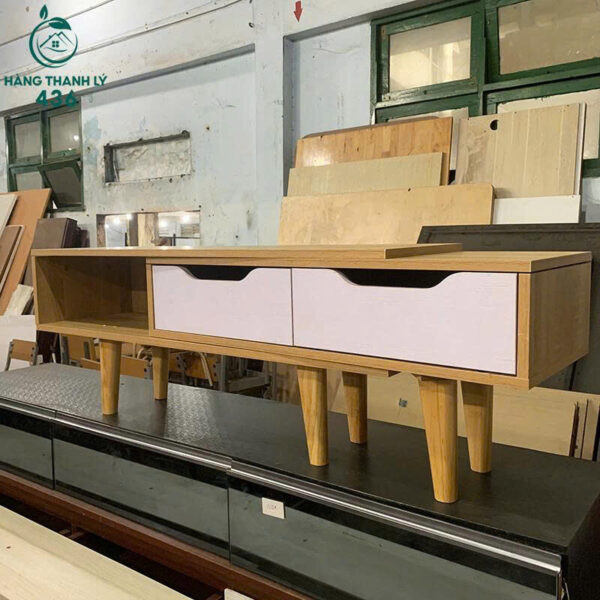 - Mô tả: Kệ tivi gỗ cũ với thiết kế nhỏ gọn, phù hợp cho không gian phòng khách, phòng ngủ hoặc căn hộ có diện tích vừa và nhỏ. Sản phẩm gồm 2 ngăn kéo màu trắng nhẹ nhàng, dễ dàng lưu trữ đồ dùng như remote, sách, giấy tờ, giúp không gian luôn gọn gàng. Phần chân trụ gỗ cao, tạo sự thông thoáng, đồng thời dễ vệ sinh bên dưới. Chất liệu gỗ bền đẹp, bề mặt phủ màu vân gỗ sang trọng kết hợp mặt ngăn kéo trắng hiện đại.