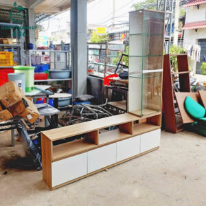 - Mô tả: Mẫu kệ tivi cũ này sở hữu thiết kế độc đáo khi kết hợp cả kệ để tivi ngang và kệ kính đứng trưng bày bên hông. Phần kệ dưới chia làm nhiều ngăn tiện lợi cho việc đặt đầu máy, loa hoặc đựng các vật dụng cá nhân. Cánh tủ dưới đóng mở dễ dàng, giúp giấu đồ gọn gàng. Phần kệ đứng bằng kính chắc chắn, phù hợp để trưng bày vật trang trí, mô hình hoặc lọ hoa. Tông màu trắng phối vân gỗ tạo sự hiện đại, dễ phối hợp với nhiều không gian phòng khách.