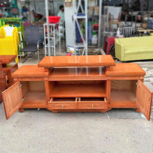 - Mô tả: Kệ được thiết kế nhiều tầng và nhiều ngăn, tối ưu hóa không gian lưu trữ và trưng bày. Phía trên kệ một mặt phẳng riêng biệt được nâng cao, lý tưởng để đặt tivi, tạo tầm nhìn thuận lợi. Hai bên là hai hộc tủ cánh mở, trên mỗi cánh tủ có chạm khắc họa tiết hoa văn đối xứng tinh xảo, tạo điểm nhấn nghệ thuật. Phần trung tâm của kệ bao gồm một ngăn kéo đôi phía dưới với tay nắm kim loại uốn lượn và một khoang mở phía trên, rất tiện lợi để đặt đầu thu, loa, hoặc các thiết bị giải trí khác.