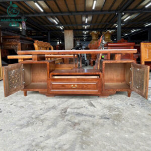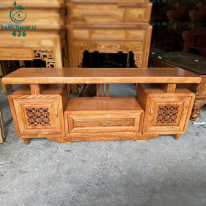 - Mô tả: Kệ tivi gỗ mang phong cách truyền thống, được chế tác từ chất liệu gỗ tự nhiên với lớp phủ bóng mịn, tạo vẻ sang trọng và bền đẹp theo thời gian. Thiết kế gồm một ngăn kéo trung tâm có tay nắm bằng đồng, tiện lợi cho việc lưu trữ các vật dụng nhỏ. Hai bên là hai tủ cánh với họa tiết dạng lưới, vừa tạo điểm nhấn thẩm mỹ vừa đảm bảo thông thoáng cho thiết bị bên trong. Mặt kệ rộng rãi, phù hợp để đặt tivi và các vật trang trí như khung ảnh, lọ hoa. Các chi tiết chạm khắc ở chân và viền cạnh thể hiện sự tinh tế trong từng đường nét.