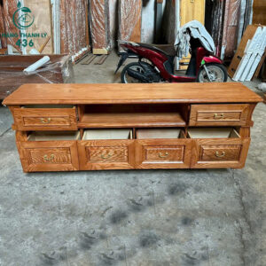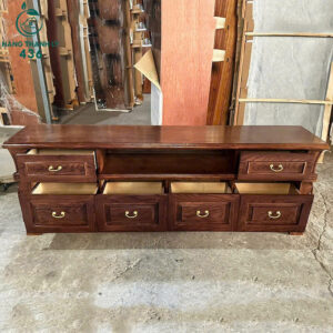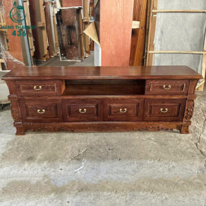 - Mô tả: Kệ tivi gỗ mang phong cách cổ điển, nổi bật với màu nâu trầm sang trọng và các đường nét chạm khắc tinh xảo ở chân và viền cạnh. Thiết kế gồm 6 ngăn kéo tiện dụng: 4 ngăn lớn ở giữa và hai ngăn nhỏ hai bên, giúp lưu trữ đồ dùng gọn gàng. Tay nắm bằng kim loại màu đồng tạo điểm nhấn thanh lịch. Phía trên ngăn kéo trung tâm là hộc mở, lý tưởng để đặt đầu đĩa, modem hoặc thiết bị giải trí. Chất liệu gỗ chắc chắn, bề mặt được xử lý mịn màng, phù hợp với nhiều không gian nội thất như phòng khách hoặc phòng sinh hoạt chung.