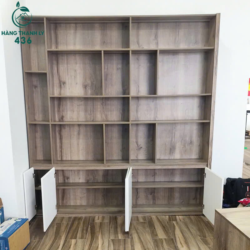 Mô tả: Kệ gỗ cũ với thiết kế nhiều ô vuông chia ngăn giúp để sách, hồ sơ, đồ trang trí hay vật dụng cá nhân rất gọn gàng. Phần dưới có 4 cánh tủ kín giúp cất đồ không bị bụi, phù hợp cho phòng khách, phòng làm việc, tiệm nail – spa hoặc văn phòng. Kết cấu gỗ công nghiệp chắc chắn, màu vân gỗ đẹp mắt, dễ phối hợp với nhiều không gian. Kệ còn đẹp, đứng vững, sử dụng ngay không cần sửa chữa. Sản phẩm phù hợp cho khách muốn tìm kệ trưng bày rộng rãi, chi phí tiết kiệm.
