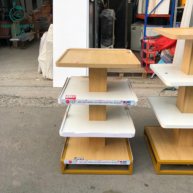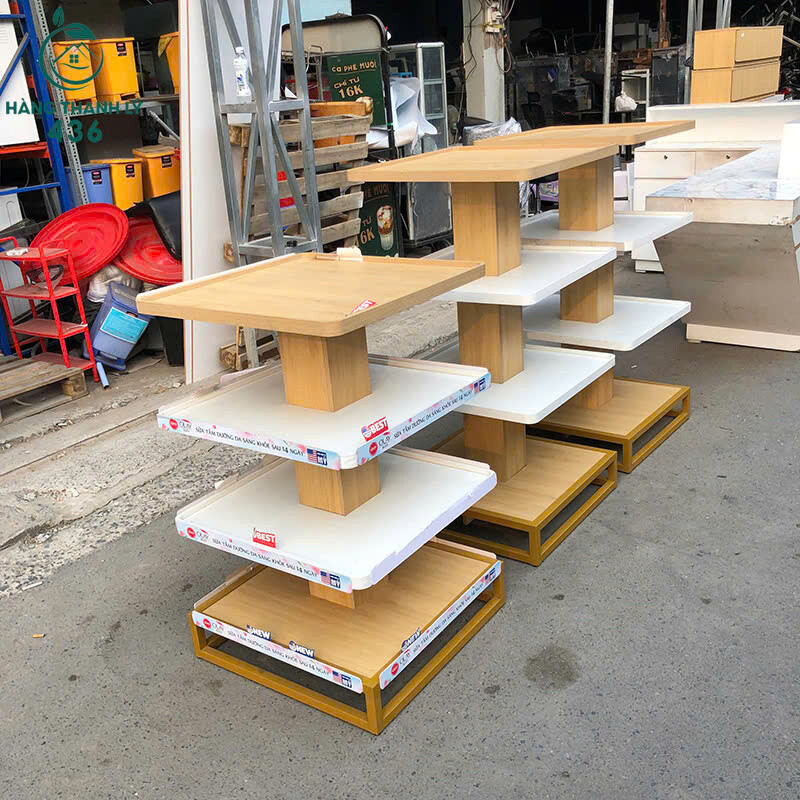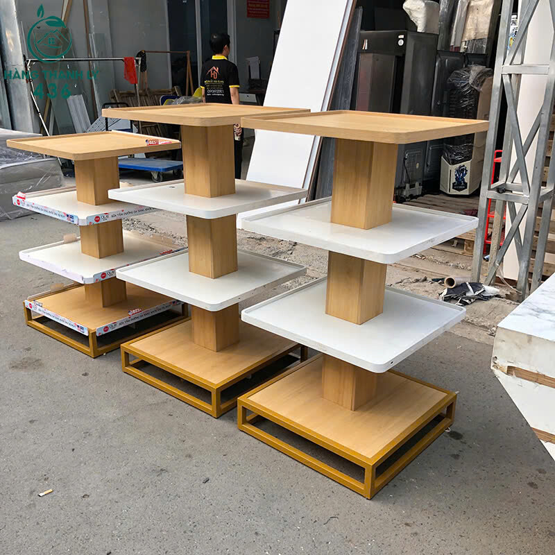Mô tả: Mẫu kệ trưng bày thiết kế dạng kệ đảo nhiều tầng, phù hợp đặt giữa cửa hàng hoặc showroom để trưng bày sản phẩm từ nhiều hướng. Kết cấu khung gỗ chắc chắn, mặt kệ phẳng rộng, bố trí nhiều tầng giúp sắp xếp hàng hóa gọn gàng và dễ quan sát. Kiểu dáng hiện đại, màu sắc sáng, phù hợp sử dụng cho shop mỹ phẩm, cửa hàng tiện lợi, siêu thị mini hoặc trưng bày sản phẩm mẫu.