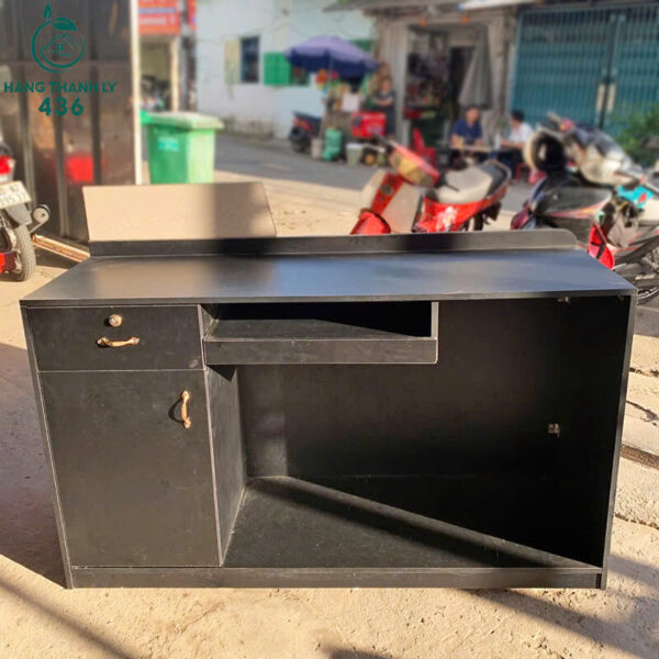 - Mô tả: Quầy lễ tân cũ màu đen được làm từ gỗ, có bề mặt nhẵn mịn, dễ vệ sinh. Thiết kế gồm hộc tủ khóa, ngăn kéo và khoảng trống rộng rãi phía dưới giúp sắp xếp đồ ngăn nắp. Màu đen phù hợp sử dụng cho văn phòng, cửa hàng, spa hoặc showroom nhỏ. Kết cấu quầy còn chắc chắn, sử dụng tốt, mang lại cảm giác chuyên nghiệp cho không gian tiếp khách. Hàng còn mới khoảng 90%, kích thước vừa phải, dễ di chuyển và bố trí ở nhiều vị trí khác nhau.