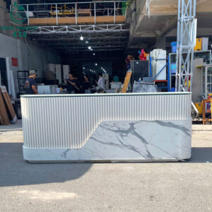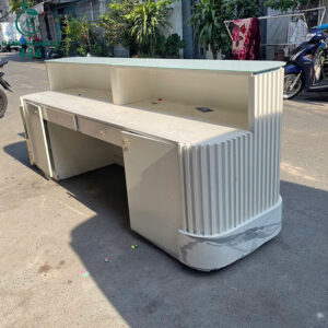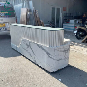 Mô tả: Trải nghiệm sử dụng cho thấy mẫu quầy lễ tân này mang lại sự tiện nghi vượt trội nhờ cách bố trí ngăn tủ khoa học phía sau, giúp lưu trữ hồ sơ sổ sách gọn gàng. Đây là giải pháp decor cực kỳ thông minh cho những đơn vị muốn nâng cấp bộ mặt thương hiệu nhưng vẫn tối ưu hóa được ngân sách đầu tư nội thất. Thiết kế bo góc lượn sóng cùng bề mặt giả đá không chỉ mang lại tính thẩm mỹ cao mà còn tạo sự uy tín đối với khách hàng khi ghé thăm cơ sở của bạn. Sản phẩm đặc biệt thích hợp cho các thẩm mỹ viện, khách sạn hoặc các công ty dịch vụ cần một khu vực thu ngân vừa đẹp vừa đa năng.