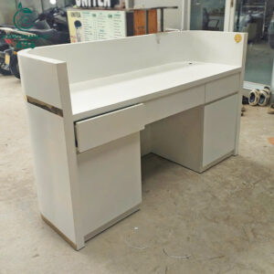 - Mô tả: Quầy lễ tân cũ này được làm từ gỗ công nghiệp bền bỉ, mặt quầy phẳng, màu trắng dễ dàng kết hợp với nhiều phong cách văn phòng. Thiết kế quầy bao gồm ngăn kéo tiện lợi và khoang để đồ, rất phù hợp cho các văn phòng, công ty nhỏ hay các cửa hàng có diện tích không quá rộng. Quầy có kết cấu chắc chắn, dễ vệ sinh và giữ gìn, không gian làm việc thoải mái cho nhân viên tiếp đón khách.