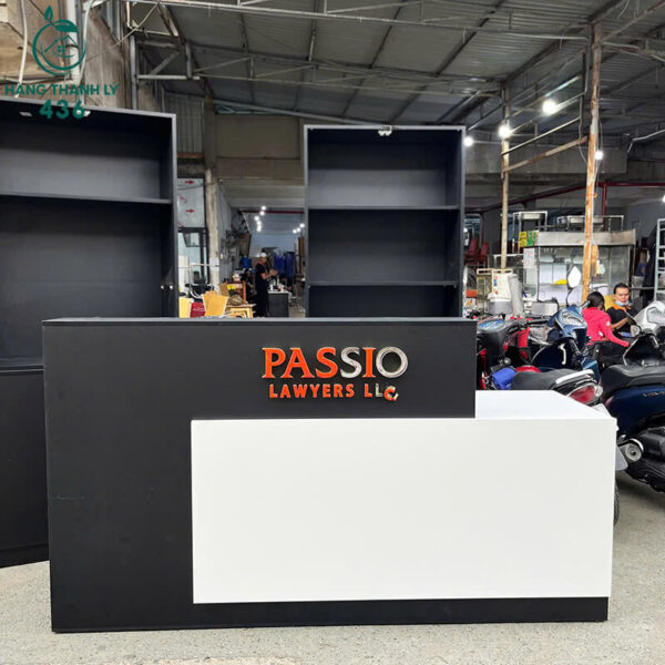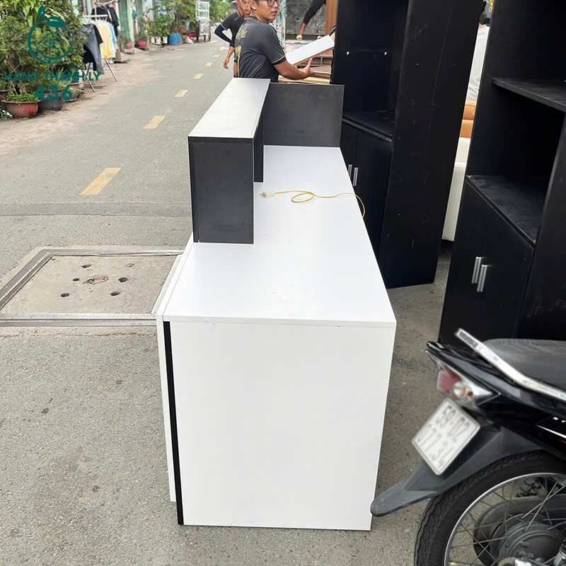 - Mô tả: Quầy lễ tân cũ với thiết kế đơn giản nhưng vô cùng hiện đại, màu sắc đen và trắng tạo nên sự sang trọng cho không gian. Sản phẩm phù hợp với nhiều không gian khác nhau, từ văn phòng, cửa hàng, đến các khu vực tiếp khách chuyên nghiệp. Quầy được làm từ chất liệu gỗ bền đẹp, dễ dàng vệ sinh và bảo quản. Các ngăn chứa rộng rãi, giúp sắp xếp đồ đạc gọn gàng, tiện lợi trong công việc. Đây là lựa chọn lý tưởng cho những ai đang tìm kiếm một sản phẩm chất lượng với giá cả phải chăng.
