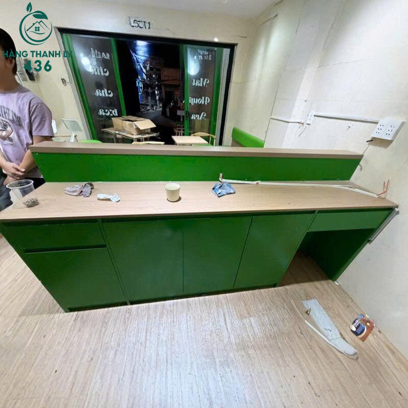 Mô tả: Quầy thiết kế dạng thẳng, chiều dài rộng rãi, phù hợp làm quầy lễ tân, quầy thu ngân hoặc quầy pha chế cho quán cafe, trà sữa, tiệm dịch vụ và cửa hàng kinh doanh. Thân quầy sơn màu xanh lá tạo điểm nhấn tươi mới, kết hợp mặt gỗ sáng giúp tổng thể hài hòa và dễ bài trí không gian. Bên trong có khoang tủ chứa đồ tiện lợi, thuận tiện sắp xếp vật dụng khi làm việc.