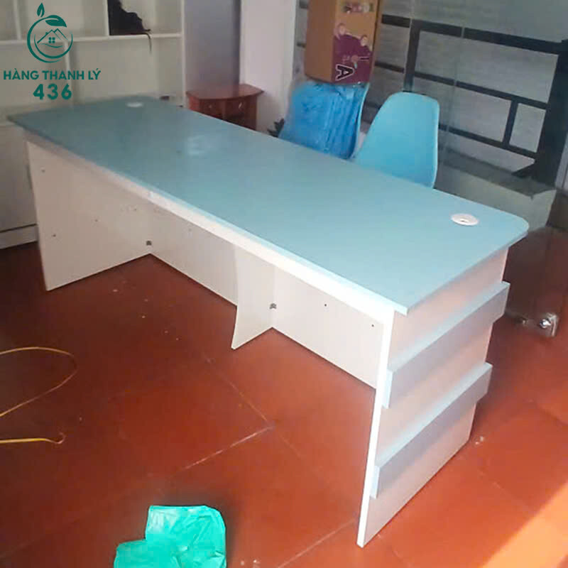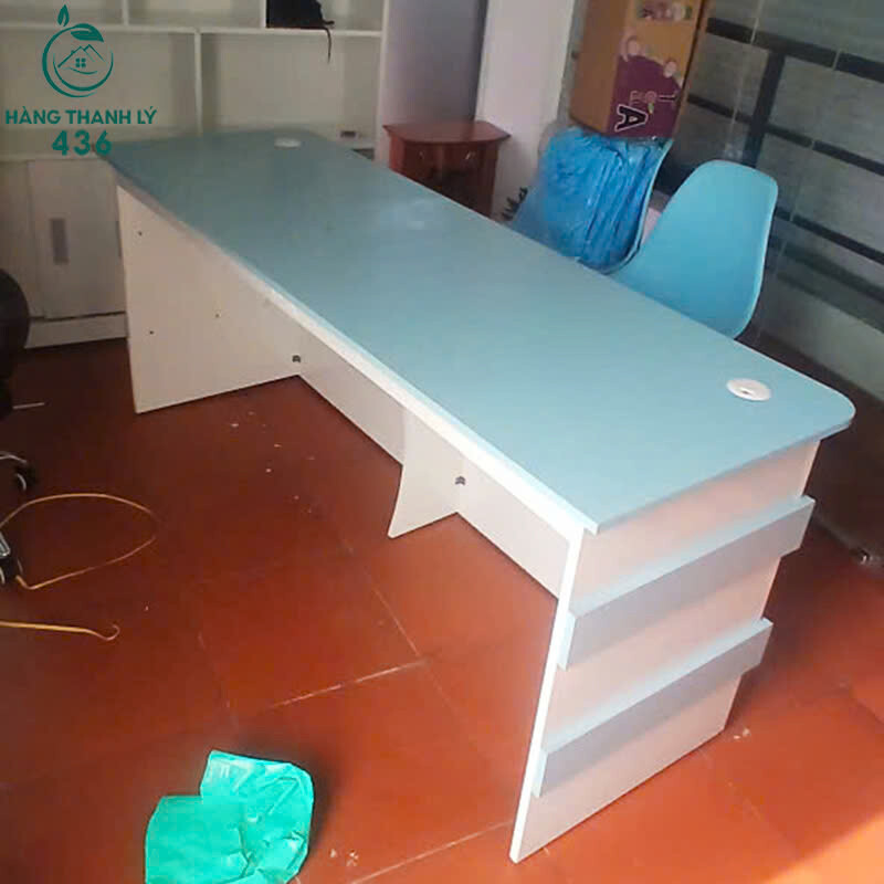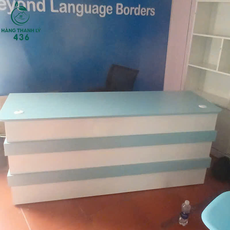 Mô tả: Mẫu quầy lễ tân cũ này có thiết kế đơn giản nhưng hiện đại, tông màu xanh phối trắng tạo cảm giác trẻ trung và thân thiện cho không gian tiếp đón. Dáng quầy dài, mặt trên rộng thuận tiện đặt máy tính, sổ sách, bảng tên hoặc vật dụng lễ tân hằng ngày. Thiết kế liền khối giúp quầy đứng vững, dễ sắp xếp tại sảnh văn phòng, trung tâm ngoại ngữ, trung tâm đào tạo hoặc cửa hàng dịch vụ. Quầy đã qua sử dụng nhưng còn mới, bề mặt phẳng đẹp, kết cấu chắc chắn, sử dụng ổn định và tiết kiệm chi phí đầu tư ban đầu.
