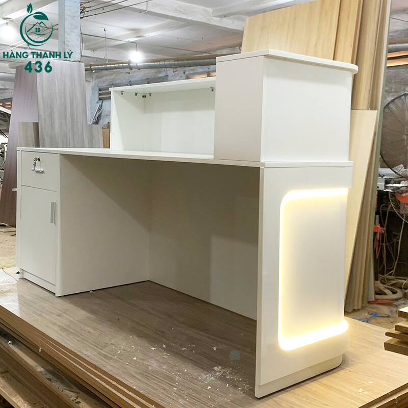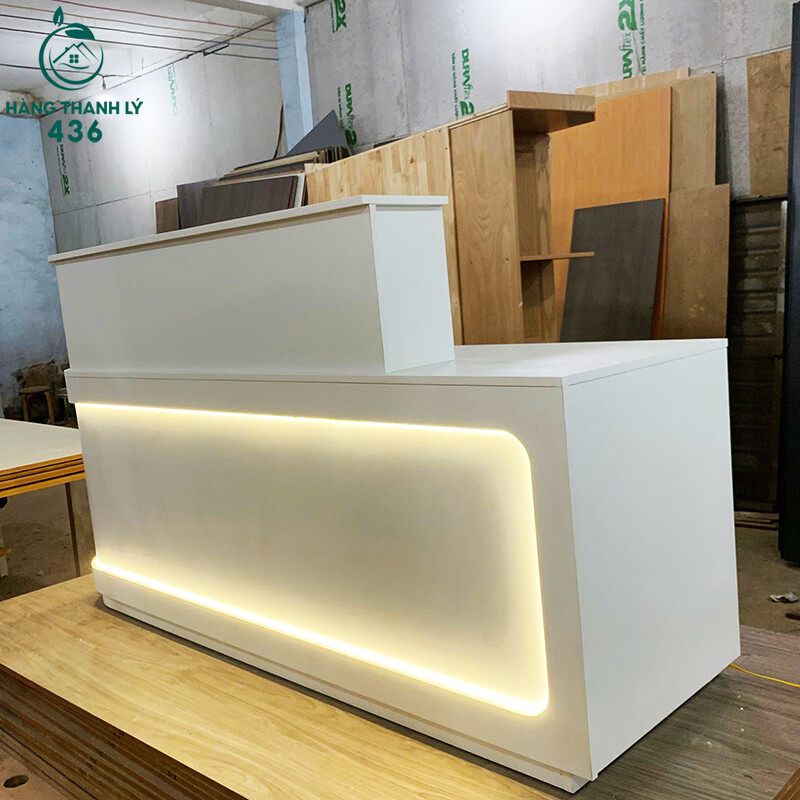 Mô tả: Chiếc quầy lễ tân này phù hợp sử dụng cho các không gian cần khu vực tiếp khách gọn gàng và nổi bật. Thiết kế bo cong giúp quầy nhìn mềm mại, an toàn khi sử dụng. Đèn LED viền phía trước tạo hiệu ứng ánh sáng nhẹ, giúp không gian sáng và chuyên nghiệp hơn. Bên trong quầy có hộc tủ và khoang trống thuận tiện cho nhân viên làm việc. Việc chọn quầy lễ tân thanh lý giúp tiết kiệm chi phí mà vẫn đảm bảo công năng sử dụng cần thiết.