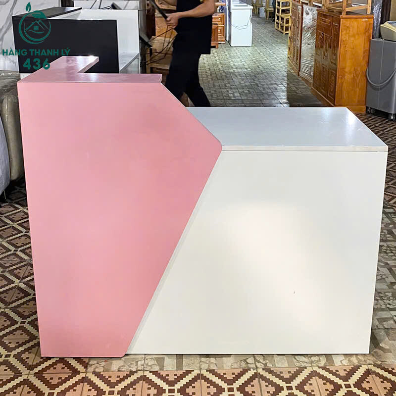 Mô tả: Mẫu quầy lễ tân này có thiết kế hiện đại với phối màu trắng hồng bắt mắt, giúp không gian trở nên chuyên nghiệp và thu hút hơn. Kiểu dáng gọn gàng, mặt bàn rộng rãi thuận tiện cho việc đặt máy tính, sổ sách và tiếp khách. Quầy phù hợp sử dụng cho spa, salon tóc, shop thời trang, văn phòng hoặc cửa hàng kinh doanh nhỏ. Sản phẩm đã qua sử dụng nhưng còn đẹp, bề mặt nhẵn, chắc chắn và sử dụng ổn định. Đây là lựa chọn hợp lý cho khách muốn tiết kiệm chi phí mà vẫn đảm bảo tính thẩm mỹ và công năng sử dụng.