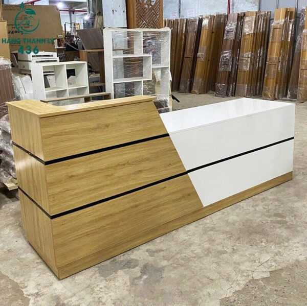 - Mô tả: Quầy lễ tân thiết kế hiện đại với gam màu trắng kết hợp vân gỗ sáng. Bề mặt quầy phẳng rộng, dễ bày trí máy tính, sổ sách hoặc vật dụng trang trí. Kiểu dáng thanh lịch, tạo ấn tượng chuyên nghiệp ngay từ cái nhìn đầu tiên, phù hợp cho văn phòng công ty, showroom, spa hay cửa hàng. Quầy có chiều dài 2m4, rộng rãi thoái mái. Chất liệu gỗ bền đẹp, dễ lau chùi. Đây là lựa chọn thanh lý tiết kiệm nhưng vẫn mang lại không gian tiếp khách sang trọng và chuyên nghiệp.