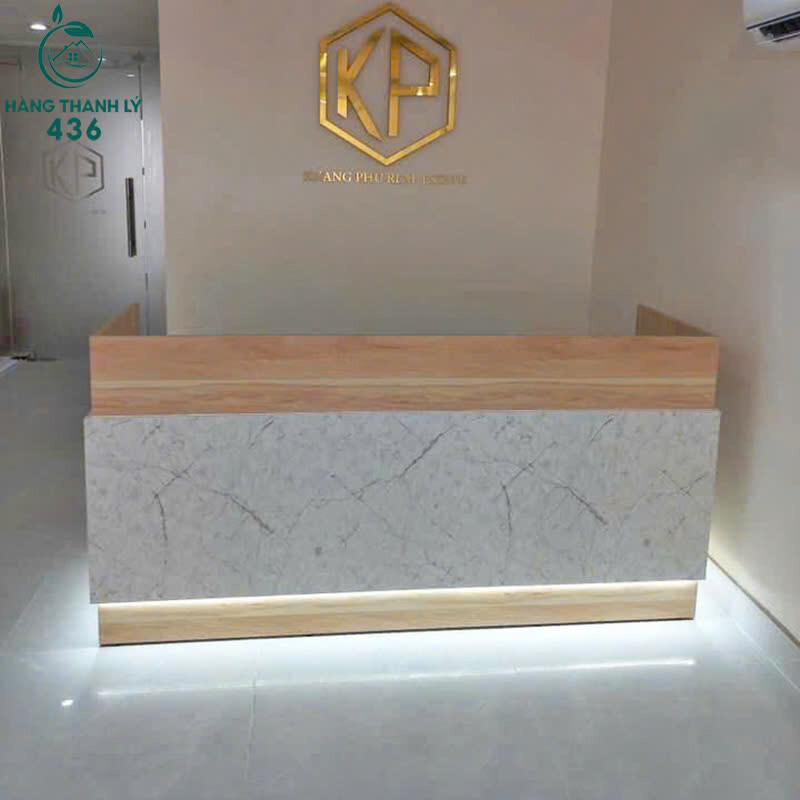 Mô tả: Quầy lễ tân với sự kết hợp tinh tế giữa đá vân mây và gỗ tự nhiên, mang đến vẻ đẹp hiện đại và sang trọng. Phần dưới được trang trí ánh sáng LED, tạo sự nổi bật cho không gian tiếp đón. Chất liệu đá cẩm thạch mang đến vẻ đẹp bền bỉ, dễ dàng vệ sinh và duy trì sự sáng bóng theo thời gian. Đây là lựa chọn lý tưởng cho các văn phòng cao cấp, showroom hoặc cửa hàng yêu cầu sự chuyên nghiệp và thẩm mỹ.