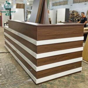 - Mô tả: Quầy thiết kế dáng chữ L bo góc mềm, phù hợp dùng làm quầy tiếp tân, quầy thu ngân hoặc quầy đón khách trong văn phòng, spa, cửa hàng. Bề mặt phủ vân gỗ đẹp mắt, kết hợp sọc trắng tạo điểm nhấn nổi bật, hiện đại. Mặt bàn trên rộng rãi đủ để đặt máy tính, máy quét mã vạch, sổ ghi chép… Bên trong quầy có khoang rộng để chân thoải mái, sắp xếp gọn các vật dụng. Dễ lau chùi, chắc chắn, phù hợp nhiều mô hình kinh doanh cần không gian tiếp khách chuyên nghiệp.