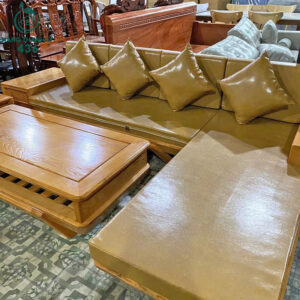 - Mô tả: Bộ sofa gỗ kèm bàn trà mang đến phong cách mộc mạc nhưng vẫn hiện đại cho phòng khách. Sản phẩm gồm khung sofa gỗ tự nhiên chắc chắn, bề mặt phủ bóng hạn chế trầy xước. Phần đệm ngồi được bọc da màu nâu vàng sang trọng, dễ dàng lau chùi và tạo cảm giác thoải mái khi sử dụng. Thiết kế dạng chữ L giúp tiết kiệm diện tích, thích hợp cho phòng khách gia đình hoặc không gian quán cà phê, phòng chờ. Bàn trà đi kèm được làm từ gỗ đồng bộ, có ngăn tiện lợi để chứa đồ.