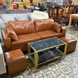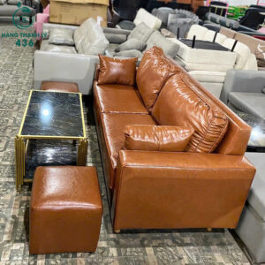 - Mô tả: Sofa bọc da nâu với thiết kế đơn giản, hiện đại, tạo sự thoải mái cho không gian phòng khách hoặc văn phòng. Bộ sofa bao gồm 2 đôn nhỏ và 4 gối ôm dễ dàng tạo dáng theo ý muốn, giúp bạn thư giãn, nghỉ ngơi sau những giờ làm việc căng thẳng. Với chất liệu da nâu bền đẹp, dễ vệ sinh và chống trầy xước, sản phẩm thích hợp cho các không gian sống hiện đại. Sofa có kích thước vừa phải, dễ dàng bài trí trong nhiều không gian, từ phòng khách đến phòng làm việc.