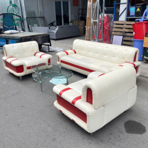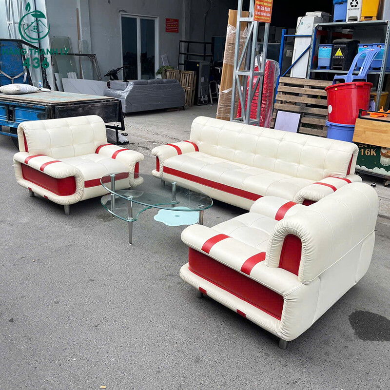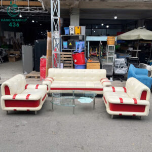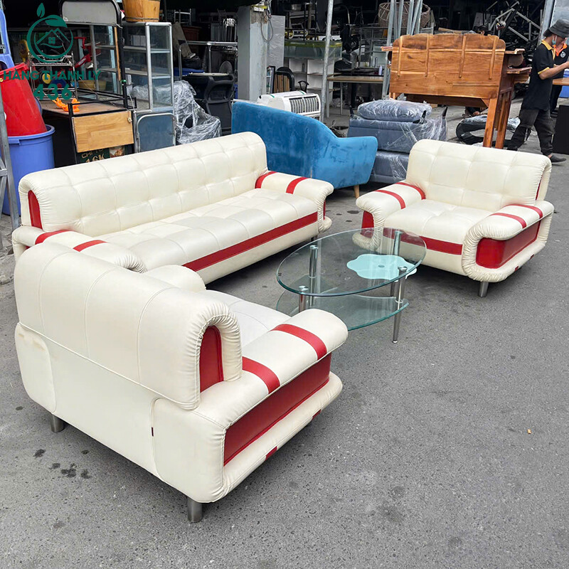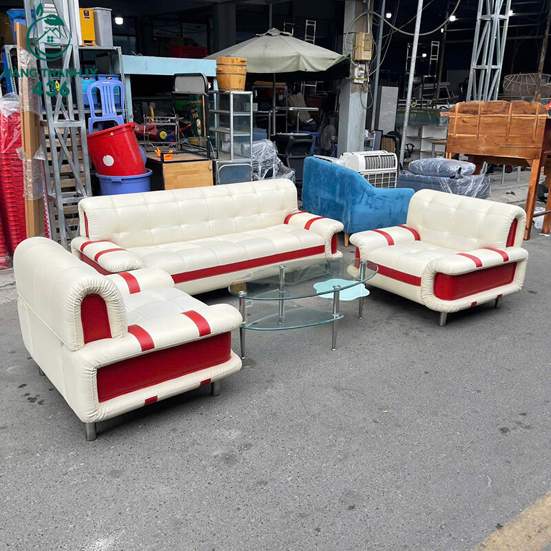 Mô tả: Mẫu salon cũ này phù hợp sử dụng cho phòng khách gia đình, khu tiếp khách văn phòng hoặc nhà phố. Sofa bọc da màu sáng, dễ lau chùi, kết hợp chi tiết viền đỏ tạo cảm giác sang trọng. Bộ ghế gồm nhiều chỗ ngồi, bố trí linh hoạt theo không gian. Bàn kính đi kèm tiện lợi khi sử dụng tiếp khách. Hàng thanh lý nhưng còn form đẹp, kết cấu chắc, đáp ứng tốt nhu cầu sử dụng lâu dài với chi phí tiết kiệm hơn so với mua mới.