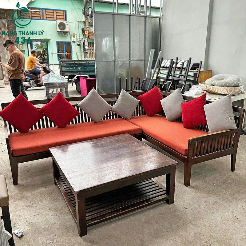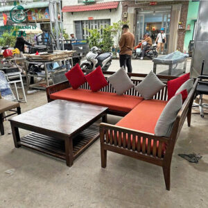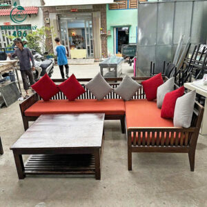 - Mô tả: Bộ sofa gỗ cũ thiết kế góc L gồm 2 băng ghế gỗ liền kề, bọc nệm màu cam nổi bật, kèm nhiều gối tựa màu đỏ và xám. Khung gỗ chắc chắn, nan tựa thẳng tạo cảm giác thông thoáng và thoải mái khi ngồi. Bộ đi kèm bàn gỗ vuông có kệ dưới tiện lợi để sách báo hoặc đồ trang trí. Kiểu dáng hiện đại, phù hợp cho phòng khách gia đình, quán cafe, phòng chờ hoặc homestay.