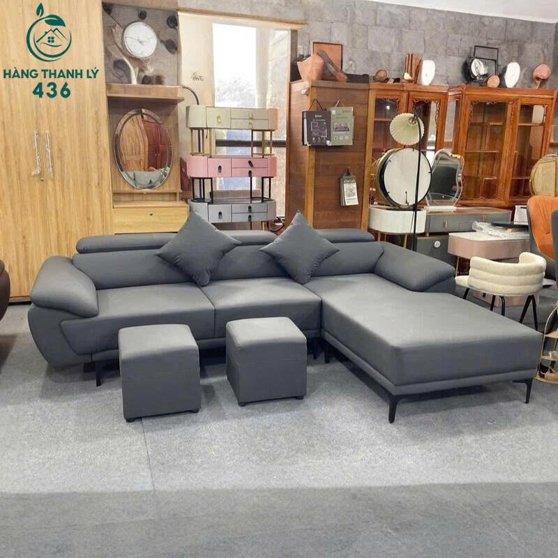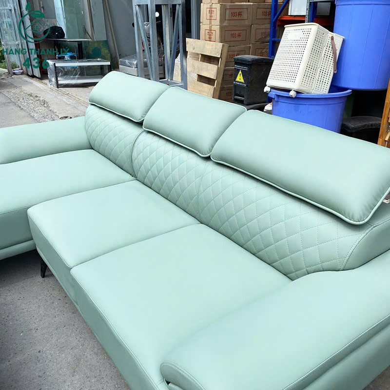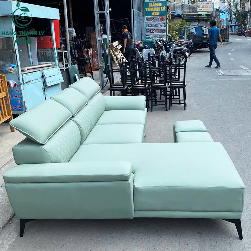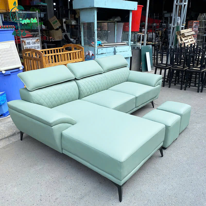 Mô tả: Bộ sofa góc L thiết kế hiện đại, form rộng rãi, phù hợp phòng khách gia đình, căn hộ hoặc văn phòng tiếp khách. Sofa bọc da màu xanh nhạt sang trọng, bề mặt còn đẹp, dễ lau chùi và sử dụng lâu dài. Phần nệm dày, ngồi êm, tựa lưng chắc chắn, có góc chữ L giúp tận dụng không gian hiệu quả. Đi kèm 2 đôn rời tiện lợi, có thể dùng gác chân hoặc ngồi thêm khi nhà đông khách. Tổng thể còn sử dụng tốt, mua về kê dùng ngay, giá tiết kiệm hơn nhiều so với hàng mới.