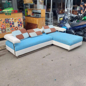 - Mô tả: Sofa cũ chữ L bọc vải màu xanh pastel phối trắng, mang đến cảm giác nhẹ nhàng và hiện đại cho không gian. Thiết kế phù hợp cho phòng khách vừa và nhỏ. Ghế có đệm dày, ngồi êm, đi kèm nhiều gối trang trí phối màu nâu – xanh – trắng nổi bật. Kết cấu vẫn còn chắc chắn, phần vải bọc không bị rách, dễ vệ sinh. Sản phẩm là lựa chọn tiết kiệm và vẫn đảm bảo thẩm mỹ cho nhà ở, quán cafe hoặc phòng trọ.