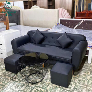 - Mô tả: Đây là mẫu ghế sofa bọc da lý tưởng cho không gian phòng khách nhỏ hoặc văn phòng làm việc. Với thiết kế tinh giản và màu đen sang trọng, ghế dễ dàng kết hợp với nhiều phong cách nội thất khác nhau, đi kèm hai ghế đôn nhỏ tiện dụng. Đệm ngồi và lưng tựa được bọc da cao cấp, mang lại sự êm ái, dễ chịu khi ngồi. Đặc biệt, chất liệu da bền bỉ, dễ dàng vệ sinh và lau chùi, giúp ghế luôn giữ được vẻ mới mẻ theo thời gian.