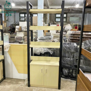 - Mô tả: Kệ trưng bày được làm từ khung sắt hiện đại với thiết kế chắc chắn, chịu được trọng lực lớn, khung sắt đen kết hợp gỗ công nghiệp sáng màu tạo nên vẻ ngoài sang trọng và tinh tế. Kệ được phân chia thành nhiều tầng, phù hợp để trưng bày sản phẩm hoặc làm giá sách. Phần dưới được trang bị tủ có cánh cửa để lưu giữ các vật dụng nhỏ gọn. Thiết kế hiện đại đem lại sự tiện nghi và cao cấp sang trọng cho không gian trưng bày.