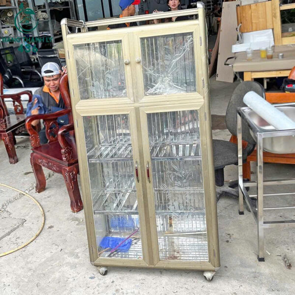 - Mô tả: Mẫu tủ chén cũ với thiết kế 4 cánh cửa kính kết hợp khung nhôm chắc chắn, giúp lưu trữ chén, bát, ly và các vật dụng bếp gọn gàng, sạch sẽ. Kính trong suốt cho phép dễ dàng quan sát bên trong, đồng thời tạo cảm giác hiện đại, sáng sủa cho không gian bếp. Các tầng kệ chịu lực tốt, không bị cong vênh khi để nhiều đồ. Bánh xe dưới chân giúp di chuyển tủ nhẹ nhàng mà không tốn sức.