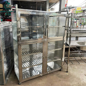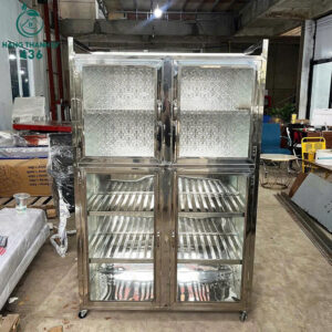 - Mô tả: Tủ inox được làm từ inox dày, có bốn cánh mở cùng hệ thống kính trong suốt giúp dễ quan sát và trưng bày sản phẩm bên trong. Thiết kế nhiều tầng thoáng, kệ nan giúp lưu thông không khí, phù hợp dùng để bảo quản chén dĩa, thực phẩm khô, hoặc dụng cụ nhà bếp. Tủ có bánh xe dưới chân giúp di chuyển dễ dàng, rất tiện khi sử dụng cho quán ăn, bếp công nghiệp, căn tin hoặc hộ gia đình. Hàng thanh lý còn rất mới, sáng bóng, sử dụng tốt – giá rẻ hơn nhiều.