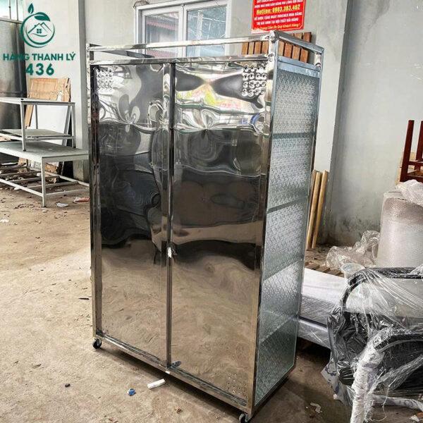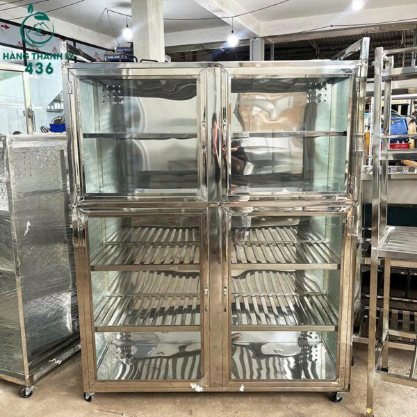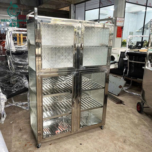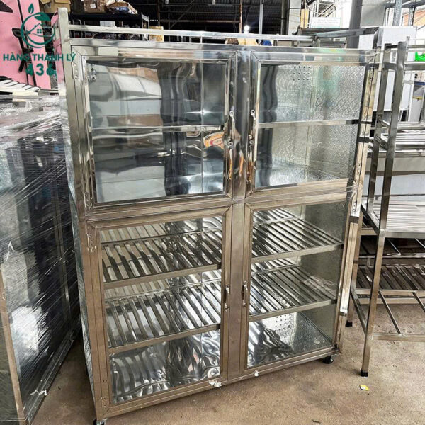 - Mô tả: Tủ inox được làm từ inox dày, có bốn cánh mở cùng hệ thống kính trong suốt giúp dễ quan sát và trưng bày sản phẩm bên trong. Thiết kế nhiều tầng thoáng, kệ nan giúp lưu thông không khí, phù hợp dùng để bảo quản chén dĩa, thực phẩm khô, hoặc dụng cụ nhà bếp. Tủ có bánh xe dưới chân giúp di chuyển dễ dàng, rất tiện khi sử dụng cho quán ăn, bếp công nghiệp, căn tin hoặc hộ gia đình. Hàng thanh lý còn rất mới, sáng bóng, sử dụng tốt – giá rẻ hơn nhiều.