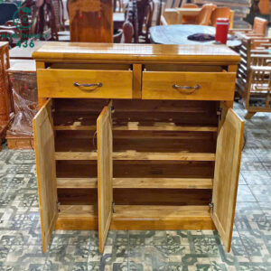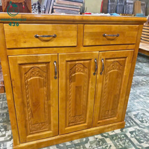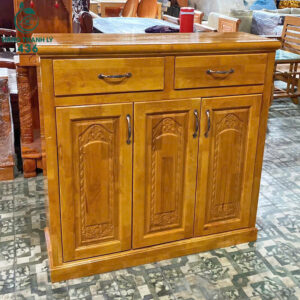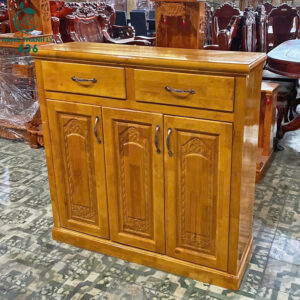 - Mô tả: Tủ giày dép gỗ thiết kế theo kiểu dáng truyền thống, có tổng cộng 2 ngăn kéo phía trên và 3 cánh cửa phía dưới. Các cánh tủ được chạm hoa văn nổi nhẹ, tạo điểm nhấn đẹp mắt mà không rối mắt. Mặt tủ rộng, có thể tận dụng để đặt đồ trang trí hoặc vật dụng thường dùng như chìa khóa, mũ bảo hiểm. Tay nắm kim loại cứng cáp, dễ sử dụng. Kích thước vừa phải, không chiếm nhiều diện tích, rất phù hợp đặt ở khu vực lối vào, ban công hoặc hành lang.