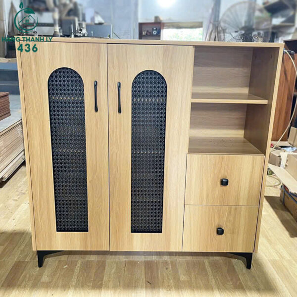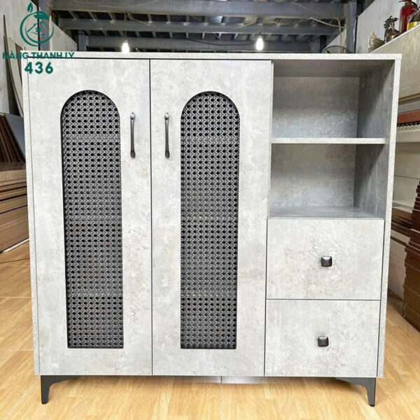 - Mô tả: Mẫu tủ giày dép này sở hữu thiết kế thông minh với 2 cánh tủ lưới giúp thoáng khí, hạn chế mùi hôi tích tụ bên trong. Bên cạnh là kệ mở chia tầng tiện lợi để túi xách, nón bảo hiểm hoặc đồ trang trí. Phía dưới còn có thêm 2 ngăn kéo dùng để cất vật dụng cá nhân như chìa khóa, áo mưa… Tủ có kích thước vừa phải, đặt được ở hành lang, cửa ra vào hay ban công. Thiết kế đơn giản nhưng hiện đại, dễ phối hợp với các kiểu không gian nội thất khác nhau.